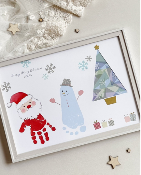 手形では サンタさん、足形では 雪だるま をぺったんして作ります