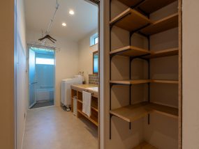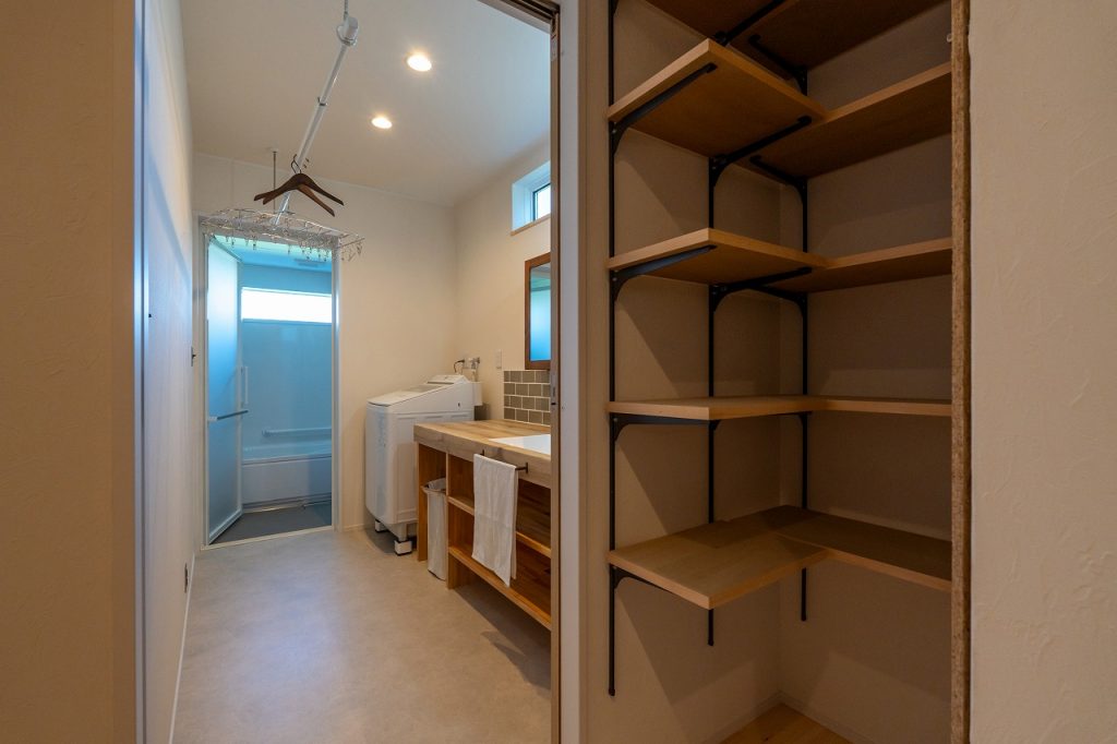 また、収納力のあるパントリーや造作洗面台など、
