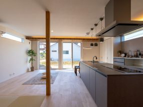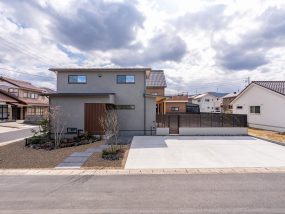 スタイリッシュな外観に、どこか可愛らしさを感じるお家。 玄関には座って靴の脱ぎ履きができるベンチを設け、 リビングには畳スペースと吹き抜けを…